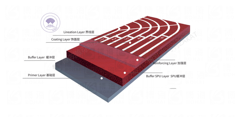 由微發泡閉孔技術的聚氨酯底膠鋪設而成,為世界田徑(國際田聯)認可推薦為各大型國際賽事運動員競賽和訓練專用場地類型,耐高低溫、沖擊吸收。